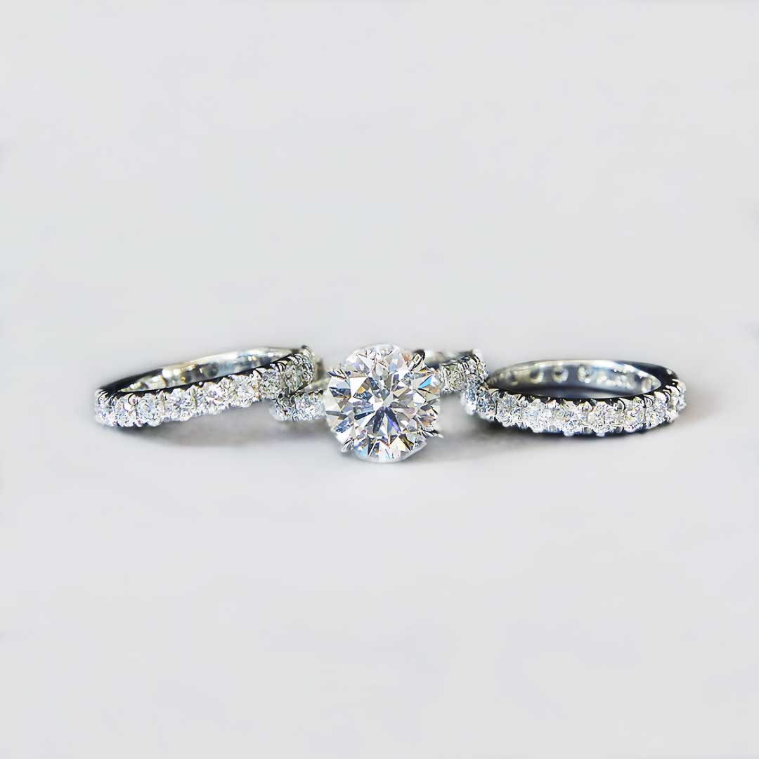 The brilliant cut diamond engagement ring radiates elegance and sparkle, showcasing a stunning centerpiece that captures light from every angle, creating a dazzling display of brilliance and fire that is simply irresistible. Its round shape, marked by precisely cut facets, allows for superior light performance, ensuring that the diamond sparkles vibrantly and makes a statement of timeless beauty and commitment. Complementing this exquisite engagement ring are two handcrafted matching eternity wedding bands, expertly designed to seamlessly blend with the central piece and enhance its splendor. Each eternity band features a continuous line of meticulously set diamonds, symbolizing everlasting love and unity, making them the perfect accompaniment to the engagement ring. Together, this exquisite trio creates a harmonious and captivating set that embodies the essence of romance and sophistication, celebrating not only the moment of engagement but also the journey of a shared lifetime filled with love and devotion. The intricate craftsmanship and attention to detail found in each piece highlight the profound significance of this union, making the set a cherished heirloom for generations to come.