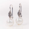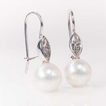 These elegant earrings showcase large, lustrous pearls gracefully suspended from diamond-shaped settings. The pearls are perfectly round and display a creamy white hue, exuding a classic charm. The settings are crafted from shiny silvery metal, likely sterling silver or white gold, and are adorned with small marquise-cut diamonds or similar sparkling stones that enhance their sophistication. With a timeless design, these earrings are ideal for complementing formal, dressy, or elegant outfits. Overall, they embody a sense of luxury, refinement, and understated glamour.