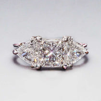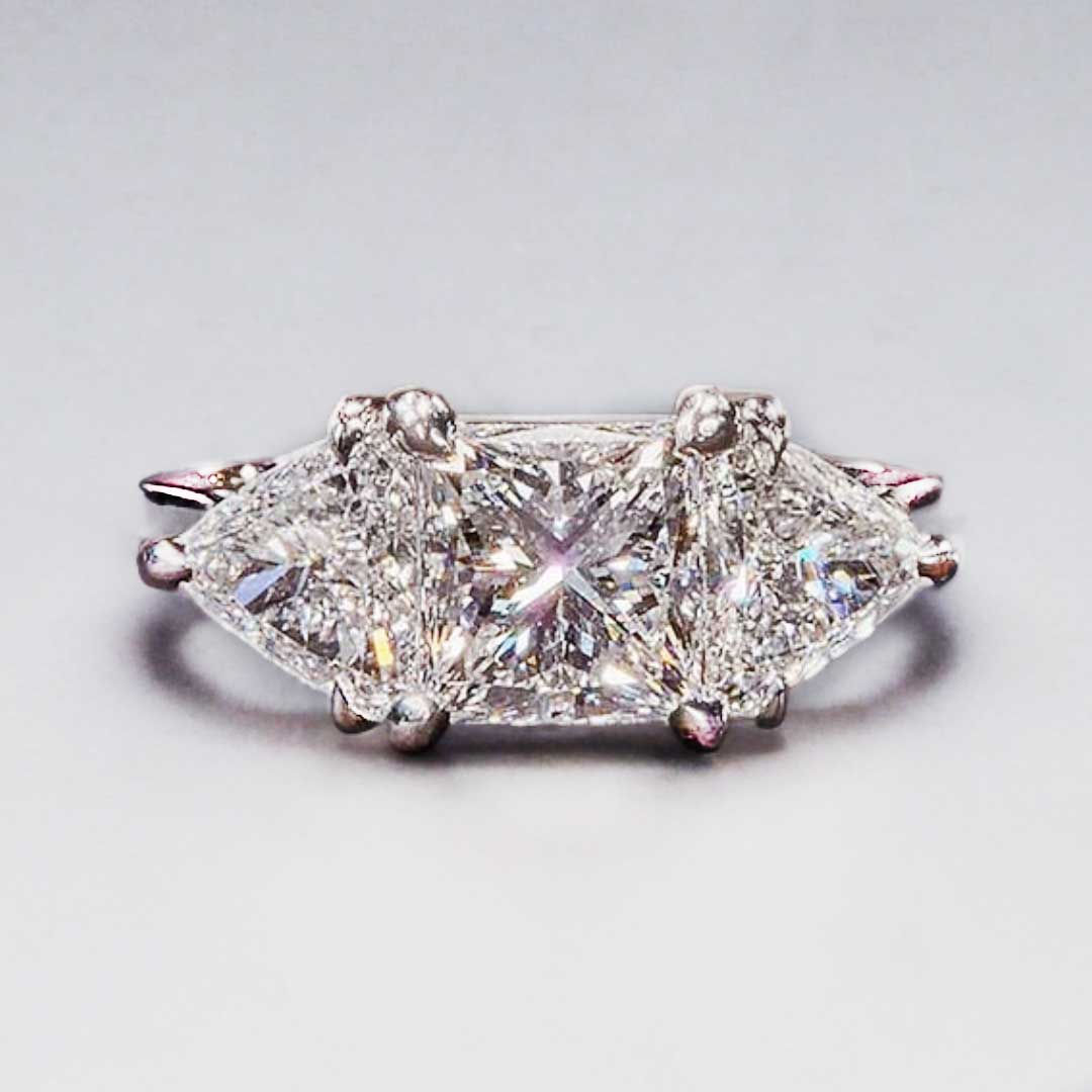 The exquisite design features a stunning princess cut center stone, complemented by perfectly matched trillions that enhance its brilliance and elegance, creating a captivating focal point that captures the light beautifully from every angle. This exquisite piece is available in a selection of luxurious metals, including Platinum for those seeking a timeless and durable option, Yellow Gold for a classic, warm hue that adds a touch of traditional elegance, and Rose Gold for a romantic and contemporary twist, allowing you to choose the perfect setting that best reflects your personal style and preference.