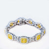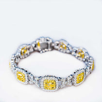 This stunning cushion cut yellow diamond bracelet is a true showstopper, radiating elegance and sophistication. Set in a luxurious white gold pave setting, it showcases a brilliant cushion cut yellow diamond at its center, exuding a warm and vibrant hue that beautifully captures the light. The diamond is encircled by a halo of smaller white diamonds, creating a striking contrast that enhances the overall brilliance and allure of the piece. The pave setting, adorned with meticulously placed diamonds, adds a shimmering texture along the bracelet’s band, ensuring every angle sparkles with brilliance. Crafted from high-quality white gold, the bracelet offers a sleek and modern aesthetic, making it perfect for both everyday wear and special occasions. With its exquisite craftsmanship and breathtaking design, this cushion cut yellow diamond bracelet is a timeless piece that promises to be cherished for generations.